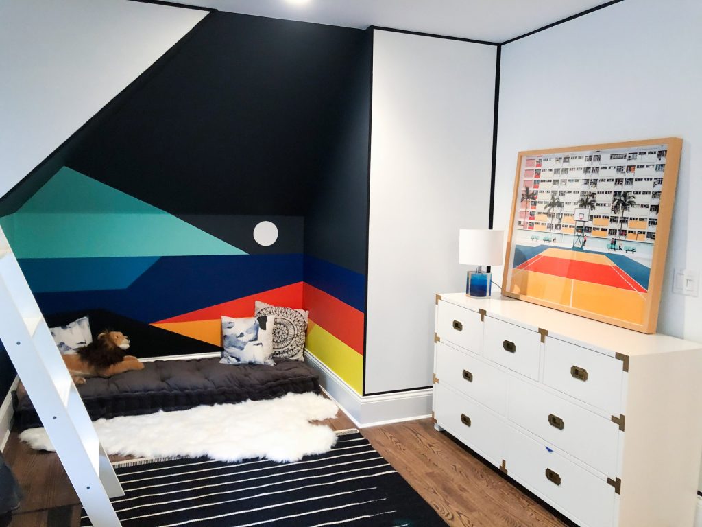 Desain seperti ini dapat diterapkan menggunakan cat dinding dan teknik masking tape, atau dengan mural decal yang siap pakai. Pastikan Anda meletakkannya pada dinding yang tidak tertutup furnitur besar agar tampil maksimal. Mural geometris juga cocok dikombinasikan dengan pencahayaan ambient untuk menciptakan suasana yang hangat dan kontemporer.